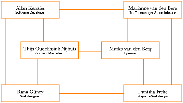 De instructies krijg ik van Rana, Thijs en soms Marko. Met problemen over het werk kan ik terecht bij Rana en Thijs. Met persoonlijke ‘problemen’ (dingen) kan ik vooral terecht bij Marko. Het werk lever ik in principe af bij degene die mij de opdracht geeft, maar als het om een website gaat, kan de klant dit zelf ook meteen zien. Maar bijv. een illustratie lever ik eerst bij Rana en Thijs af en daarna wordt het pas gebruikt voor waar t nodig is.