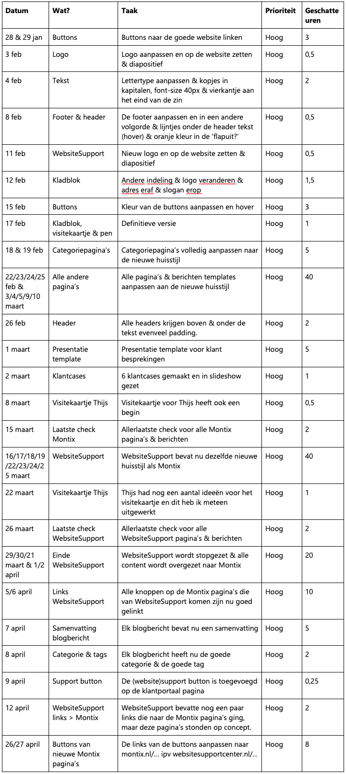 Ik mocht meteen aan de slag met de Montix website, waardoor ik in het begin nog niet echt een ‘besluit’ durfde te nemen of mijn eigen mening durfde te geven. Dit kwam later wel goed en toen konden we met zn allen ook betere besluiten nemen. Je krijgt dan namelijk meningen van 3 kanten. Hoe meer, hoe beter natuurlijk.