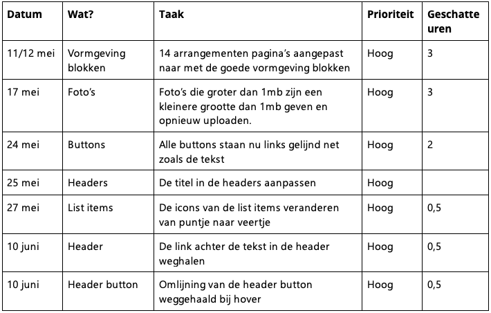 De oude arrangementen pagina’s omzetten naar de nieuwe stijl, afbeeldingen opnieuw plaatsen met een kleinere bestandsgrootte, buttons goed zetten, de headertitels aanpassen, buttons aanpassen, links van header verwijderen, list item icons veranderen